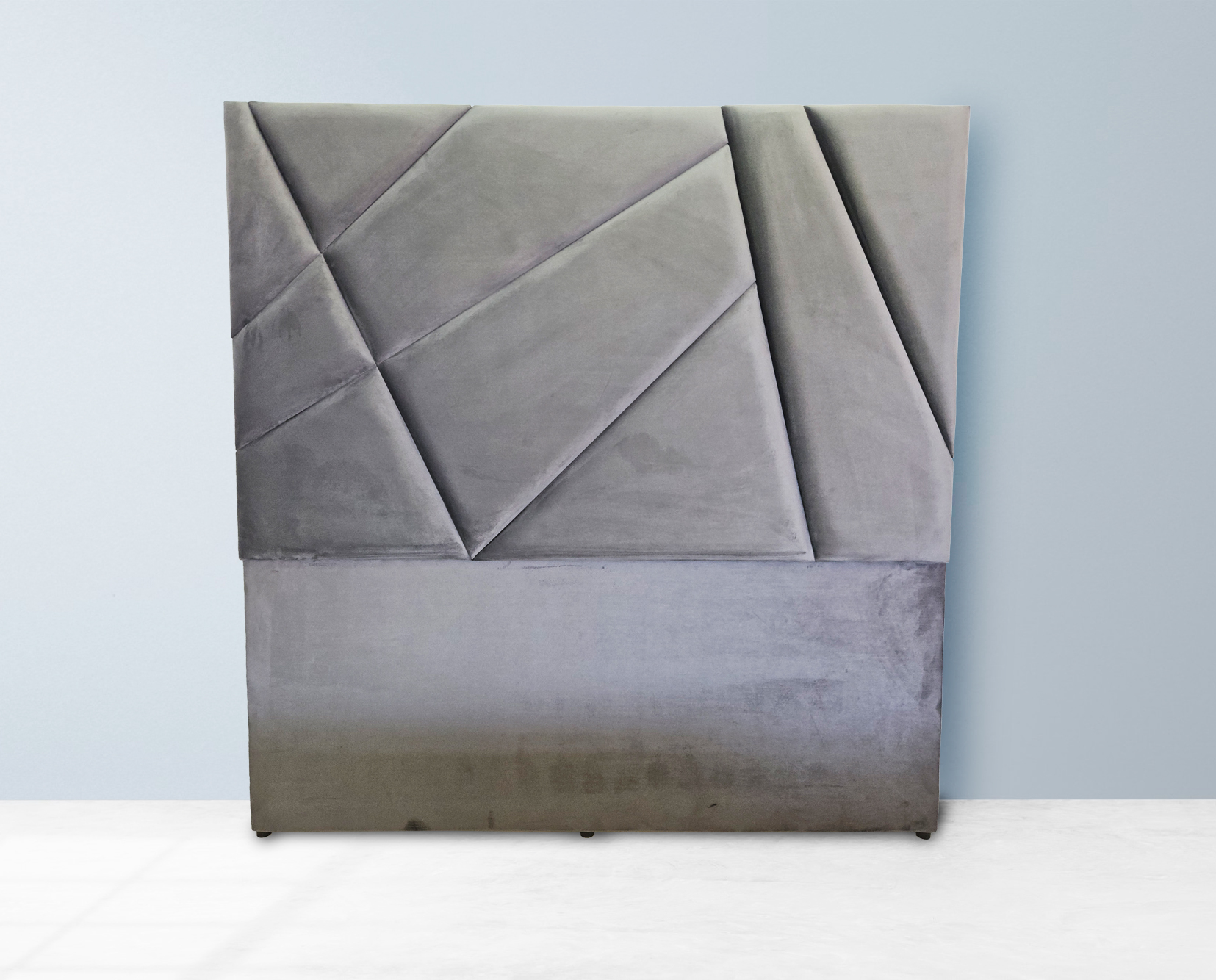 A uniquely designed, floor-standing velvet headboard featuring abstract paneling that creates a fractured, geometric look. The bold structure adds depth and dimension, making it a perfect choice for modern interiors. Comes in a wide range of colours.