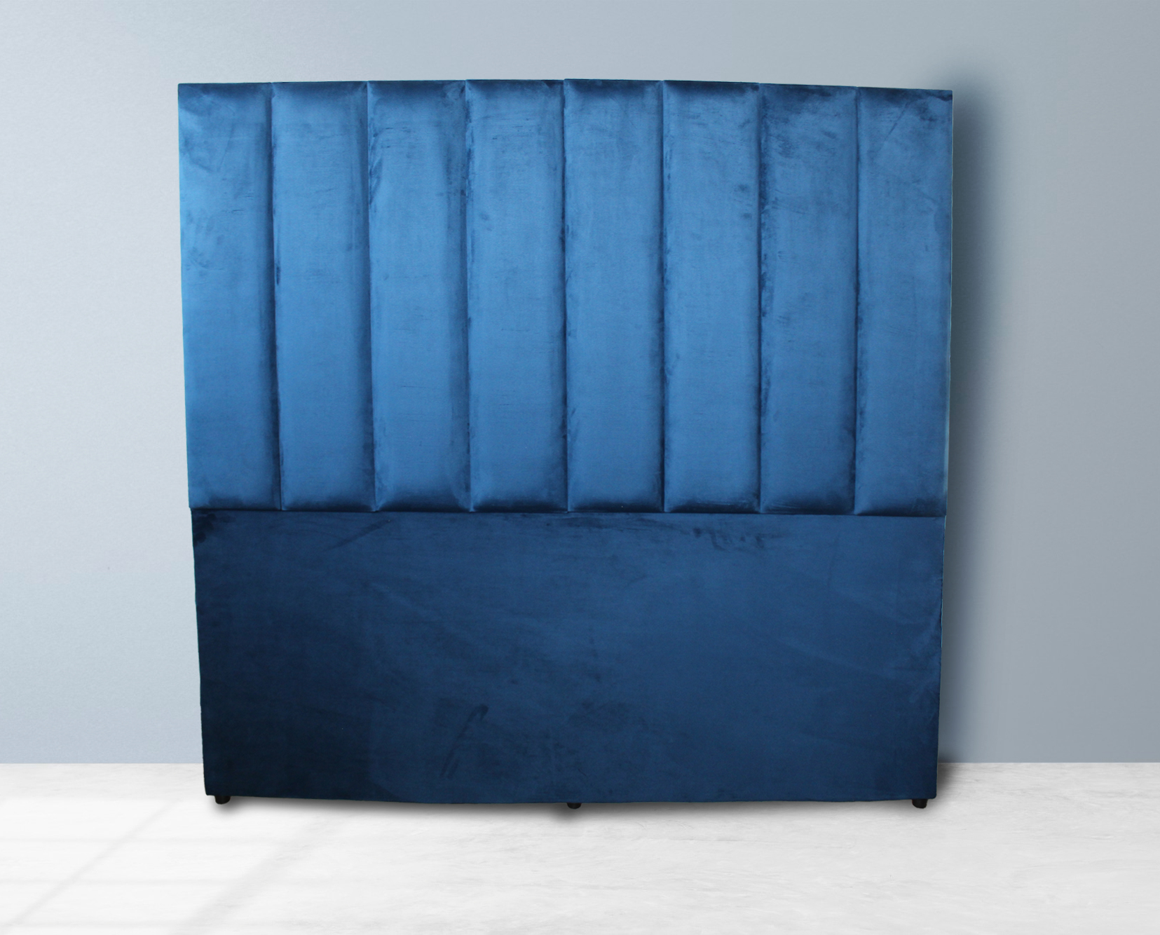 A sleek, velvet headboard with clean vertical panels running from top to bottom. Its floor-standing design delivers simplicity and sophistication, with a variety of colours to match your décor.