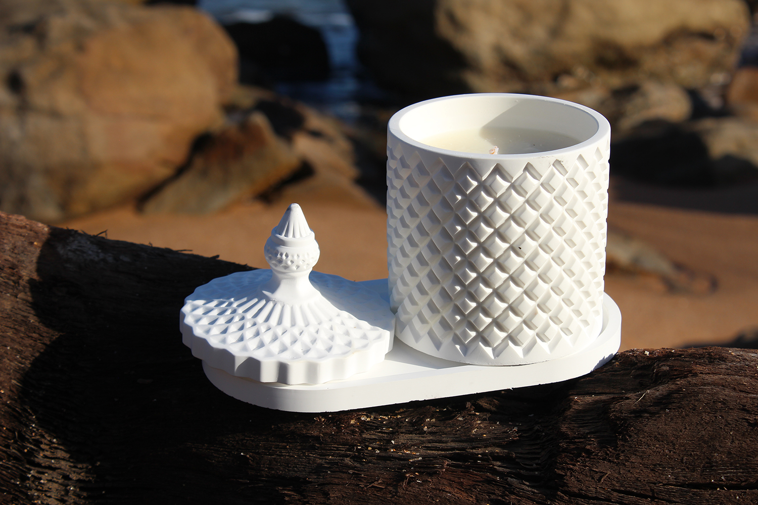 A 300-gram candle with a removable lid inspired by classic diamond tower forms. Underplate not included. Though it resembles traditional glass decor, this candle is crafted in a more tactile, matte finish for a grounded, elegant feel.